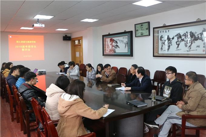 本网讯(国旅学院 熊丹丹)随着考研笔试时间的临近,为了鼓励考研学生在最后的冲刺阶段保持学习热情,坚定考研信念。11月28日下午,国旅学院在院行政楼三楼会议室召开2018届考研学生考前慰问暨冲刺阶段动员大会。院党委书记贾冠忠、院长苏勤、院党委副书记乔静、毕业班辅导员以及2018届考研学生代表参加了会议。会议由院党委副书记乔静主持。