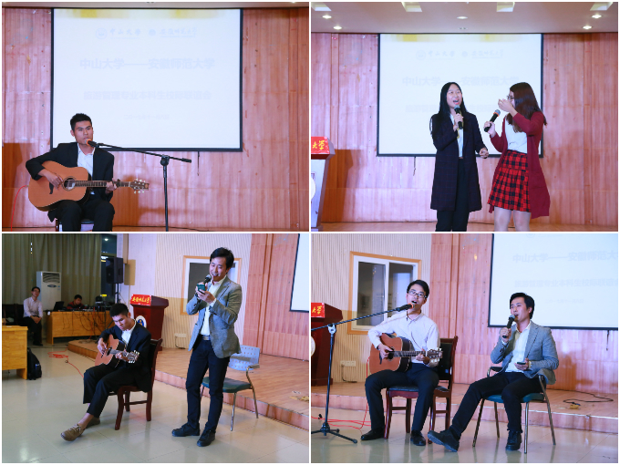 晚上19:00,当夜幕降临的时候,中山大学旅游学院师生受邀参加中山大学-安徽师范大学本科生校际联谊会。中山大学旅游管理与规划系主任左冰副教授、副主任刘逸博士、国旅学院党委副书记乔静等领导老师出席了联谊会,两校学生相间而坐,以更加轻松活泼的形式深入交流。两校2015级旅游管理专业的班长分别为对方佩戴上自己学校的校徽,象征着长江之滨的师大学子和珠江之畔的中大学子结成互信互助的朋友。随后,两校师生将精心准备的文艺节目一一呈现,国旅学院精心准备的茶艺节目《高山流水》博得满堂彩,一壶清茶用以招待远方来访的朋友;安徽师范大学礼仪队的姑娘们踏着音乐的节拍展示出我校学生的礼仪风采,引出掌声经久不息;中山大学旅游学院的同学们带来了粤语经典歌曲《红日》、法语歌曲《Je M’appelle Hélène》和英文歌曲《Radioactive》,观众的节拍合着旋律的起伏,气氛热烈。联谊会在中山大学旅游管理与规划系副主任、硕士生导师刘逸老师和我校国旅学院团委副书记吴辉老师合作的吉他弹唱《外面的世界》中达到了高潮。当两校师生合唱安徽师范大学校歌和中山大学校歌时,联谊会在动人的氛围中缓缓落幕。