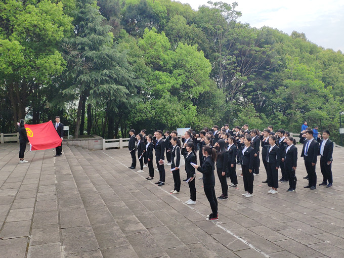 到达烈士陵园后,由尹国栋同学带领大家齐唱团歌,雄壮而有力的团歌让大家情绪高昂,深受鼓舞。接着,团员们来到庄严肃穆的烈士纪念碑前缅怀先烈,陈祥云携全体团员向革命烈士默哀并鞠躬,团小组组长作为代表向革命烈士敬献鲜花,表达对革命先烈的敬仰和哀思。在烈士纪念碑前,团支书王欣悦带领团员重温入团誓词,激励大家不忘初心。