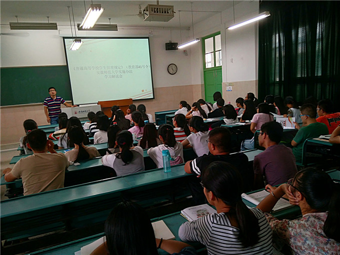 紧接着,赵将又详细解读了安徽师范大学对于《普通高等学校学生管理规定》(教育部41号令)的实施办法,他谈到,新《规定》涉及学生的权利和义务、学籍管理、校园秩序与课外活动、奖励与处分、学生申诉等几大方面,充分体现了以学生为本的思想。同时,赵将着重强调新学期大家应该明确自己的发展方向,做好学期规划,学好专业知识的同时加强素质拓展,不断提升自己,为以后的全面发展打下牢靠的基础。