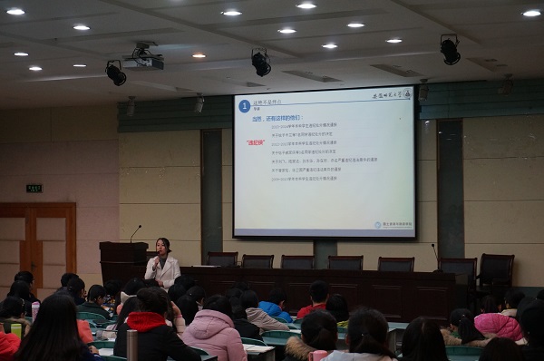 班会伊始,刘冠琪老师向同学们介绍了2012级优秀学姐盛婷同学的大学故事,从大小奖项荣誉到实际生活,从师范技能、志愿服务、爱心支教、组织策划各个方面和我们分享榜样的力量。接着刘冠琪老师以可爱滑稽的图片同学们分享了“低头族”、“手机控”、“觉觉党”,以幽默风趣的话语提醒我们时间管理的重要性,同学们听地十分认真,班会的气氛轻松活跃起来