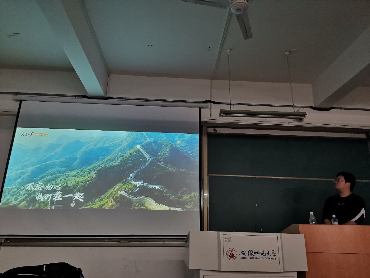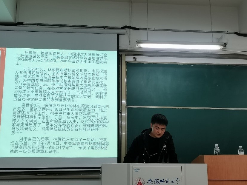 首先,主持人袁明峻同学为大家播放了由光明日报出品的建党百年主题MV《少年》,通过一首歌和一段视频回顾了建党以来的许多重大历史事件。视频播放结束后,袁明峻分享了自己的观看感受:为什么会把中国称作“少年”?在我个人的理解上,“少年”指了许多,指中国,指共产党,指那些做出过贡献但如今青春不再的人们,指年轻的新青年们。当初的初心现在依旧在不断传承延续,被更多年轻人当作是自己的使命。但“少年”,不只是说初心不改,不只是说永葆青春活力,“少年”一词,更有对未来的展望,对明天更好的发展与无穷潜力的期待。这是一种赞美,一种自信,更是一个美好的祝愿。”接着,入党积极分子耿艺榕向我们介绍了中共早期党员张静泉同志父子二人共守承诺的故事。耿艺榕指出:我们要明确自己的初心与使命,为国家富强和民族复兴去奋斗、去践行,做到无愧于自己也无愧于时代。另一位入党积极分子王宏志则以PPT的形式向我们介绍了中国人民解放军十大挂像英模:张思德、董存瑞、黄继光、邱少云、雷锋、苏宁、李向群、杨业功、林俊德、张超;为我们介绍了他们的生平以及伟大功勋。王宏志说,我们或许没办法像他们那样伟大,但我们可以像他们一样,为祖国的发展,人民的幸福做出自己的贡献。