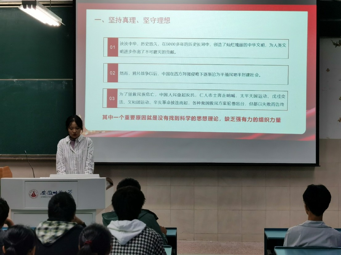 姚兰结合PPT向同学们介绍了中国共产党百年奋斗历程和伟大建党精神,并以“中国共产党为什么能”为切入点展开此次主题团日交流讨论,并号召新时代的大学生应该继承和弘扬党的精神,坚持真理、坚守理想,践行初心、担当使命,不怕牺牲、英勇斗争,对党忠诚、不负人民。最后姚兰通过一段视频带领同学们领略了繁荣昌盛的中国,同学们反响热烈,并积极分享感悟。