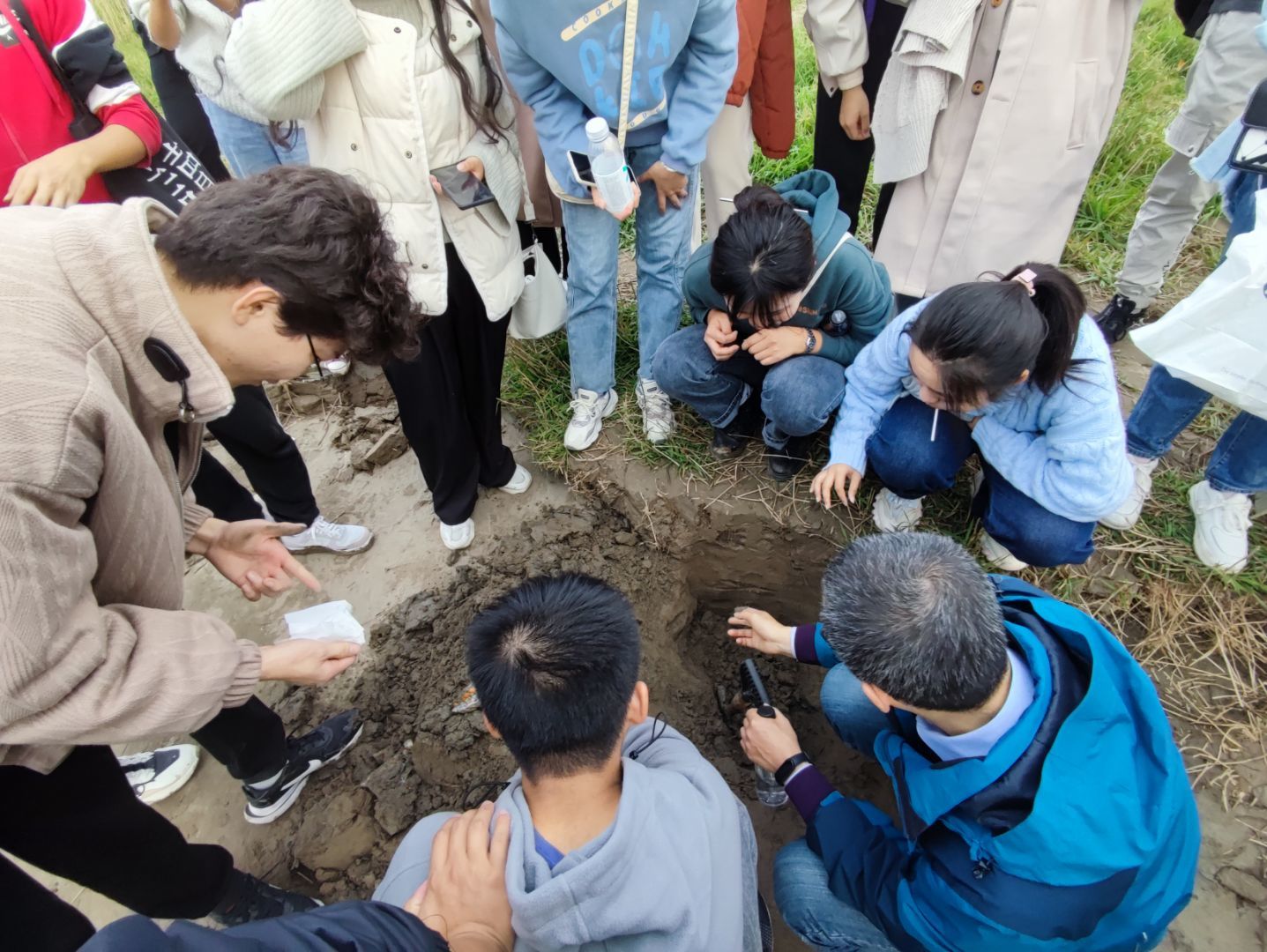 滨江之行如约而至。1128日下午14002021级地理信息科学专业全体同学准时齐聚于中江塔。首先是由胡春生老师向同学们介绍青弋江河口基本背景知识,包括青弋江河口地貌的特征局部侵蚀基准面对河流纵剖面的控制干支流交汇处泥沙运动对地貌发育的影响以及人类活动对青弋江下游河道发育的影响。随后胡春生老师的带领同学们沿着十里江湾公园防洪堤抵达江滩进行分组作业,用工兵铲挖掘土坑观察土壤的切面和其分层结构。通过观察不同深度的土壤颜色,选取部分土壤在手指间摩擦,感受其质地与颗粒的大小,结合视觉,触觉推测其形成原因。此外,胡春生老师还将长江两岸的沉积物进行对比,进一步分析长江芜湖段两岸侵蚀堆积作用的差异和芜湖长江大龙湾的成因。