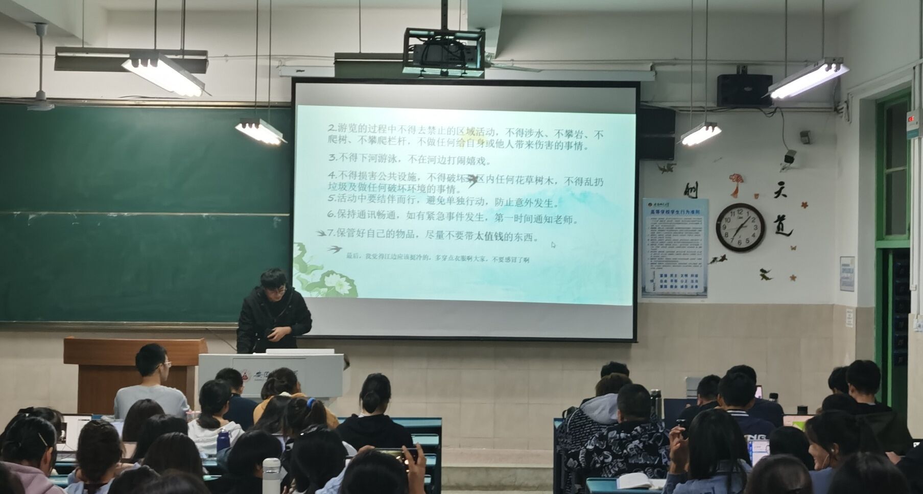 外出实践,安全第一。为确保此次出行的安全,出发前班级全体同学在行至楼四号楼204303教室开展了自然地理学外出实践安全教育主题班会安全委员韩东杰在会上结合野外考察活动流程强调了外出应当遵守交通规则、听从老师安排、不得单独行动同学们认真倾听,记录重要事项。