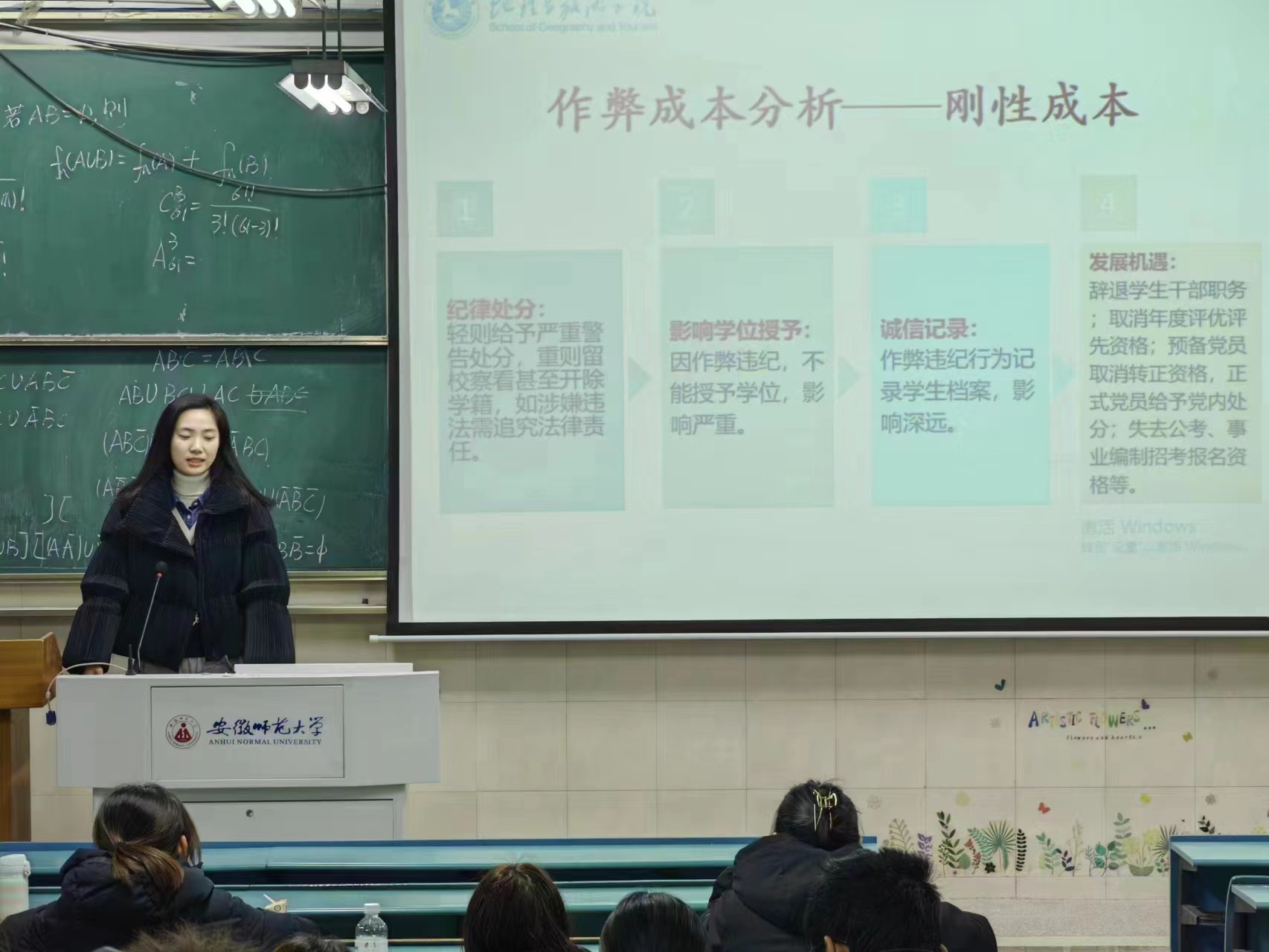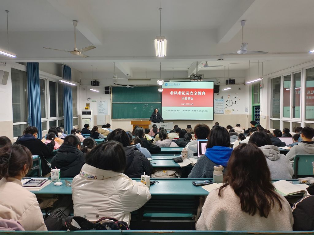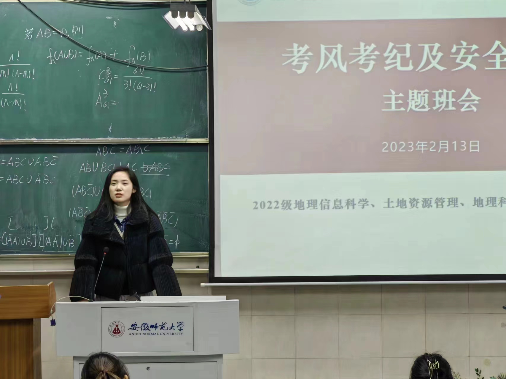 本网讯(bat365中国在线平台官方网站 魏语菲、陈祥云)2月13日晚,2022级地理信息科学、地理科学(拔尖人才班)、土地资源管理分别于教学楼4号楼201、202、302教室举行考风考纪教育主题班会,会议由辅导员陈祥云主持,全体180名同学参与此次会议。