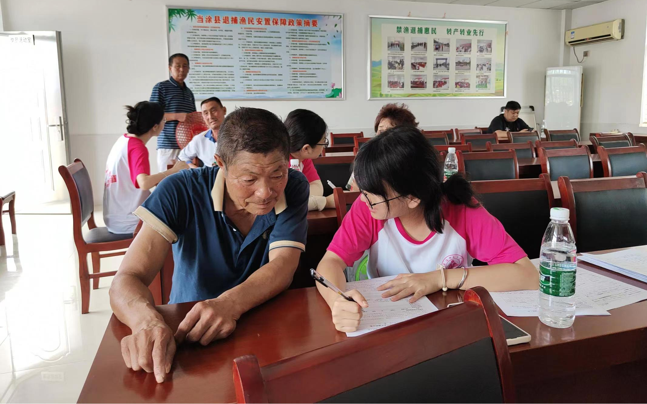 “你好...想问一下...谢谢您的配合。”一个小小的会议室里,队员与渔民交谈的声音不绝于耳,队员都在尽力大声说话,让上了年纪的老渔民能够听清楚、听明白。天气炎热、行程匆忙、语言不通等困难阻挠着这支队伍,但是没有这些困难没有让他们停下。他们深入基层,在调研中,收集到了几十份渔民生计数据和当涂县政府部门的帮助渔民成功转产就业并带动其他渔民共同致富的好方法。后期,他们将继续总结调研成果,提出系统的帮助退捕渔民转产就业的好策略,为退捕渔民生计的可持续性做出贡献。