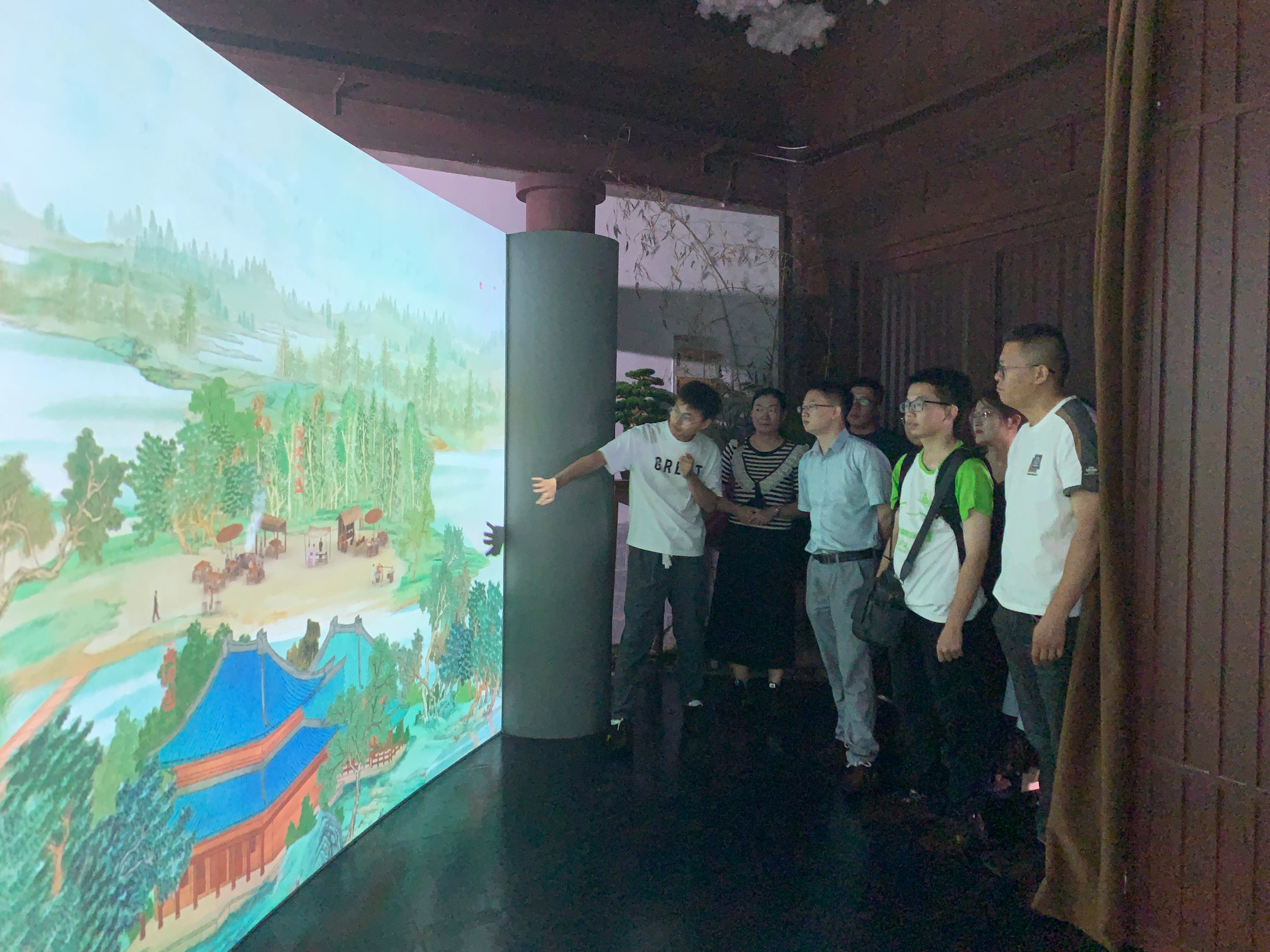 在景区万经理的带领下,两校师生对现阶段颍州西湖已经开发的区域进行实地参观,梳理现已开发利用的文化旅游资源。在怡园中,数字光影互动长卷《颍州西湖赋》实现了科技和文化旅游的结合,它利用高科技手段,将颍州西湖美景与欧苏诗词融贯其中,为旅游者带来更直观的沉浸式体验。兰园采用传统院落式布局,园内建设的有苏轼展厅、欧阳修展厅、兰花展厅以及游廊,集观光旅游和文化体验于一体。